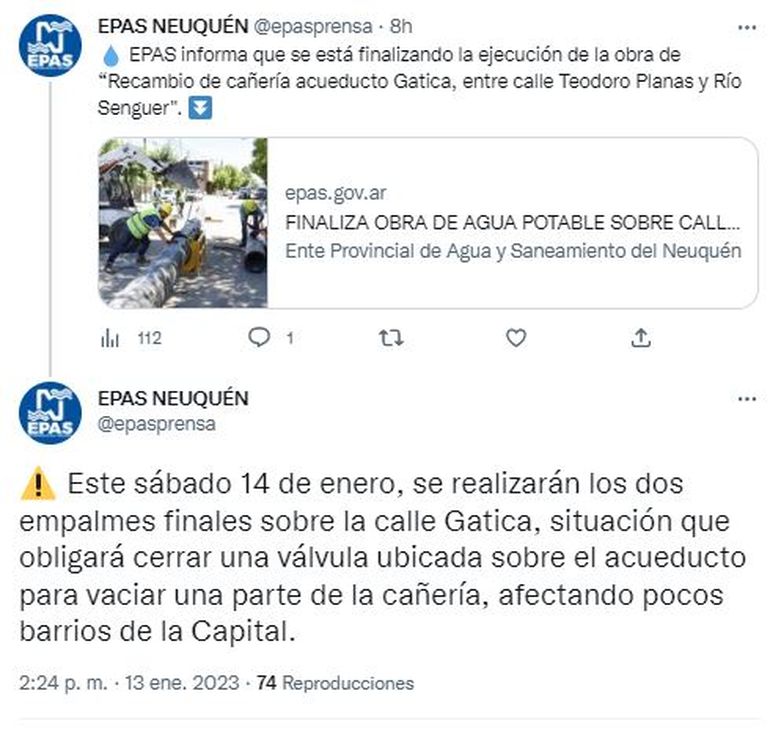 El Ente Provincial de Agua y Saneamiento (EPAS) informó que este sábado se realizarán los dos empalmes finales sobre la calle Gatica; uno en la intersección con la calle Aconcagua y el otro sobre Río Senguer. Esta situación obligará a cerrar una válvula ubicada sobre el acueducto que permitirá vaciar sólo esa parte de la cañería, afectando a pocos barrios de la ciudad.