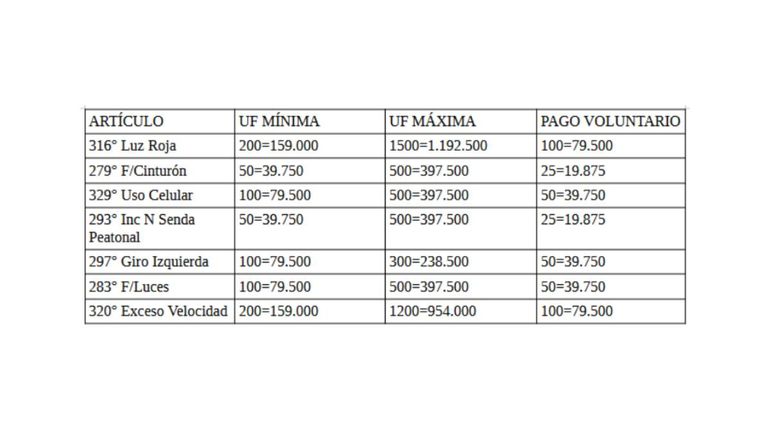 Por cruzar un semáforo en rojo, la multa económica irá de 79 mil a 1,2 millones de pesos. Por la falta de cinturón se sancionará con un valor que va de los 19 mil a los casi 400 mil pesos y aquellos que sean captados usando el celular deberán pagar entre 39 mil pesos y casi 400 mil.