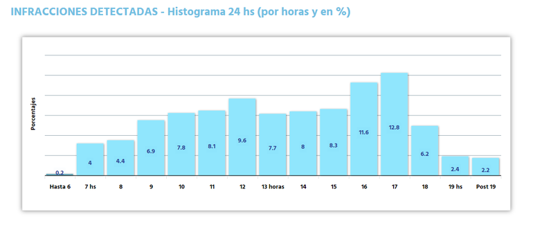 El horario del mediodía también tiene un alto porcentaje de incumplimiento, siendo un 17,3% entre las 12 y las 13, horario que, según indicó Labrín, coinciden con los datos de los lectores de patentes, que indican que es una franja horaria con mayor movimiento de autos en la ciudad.