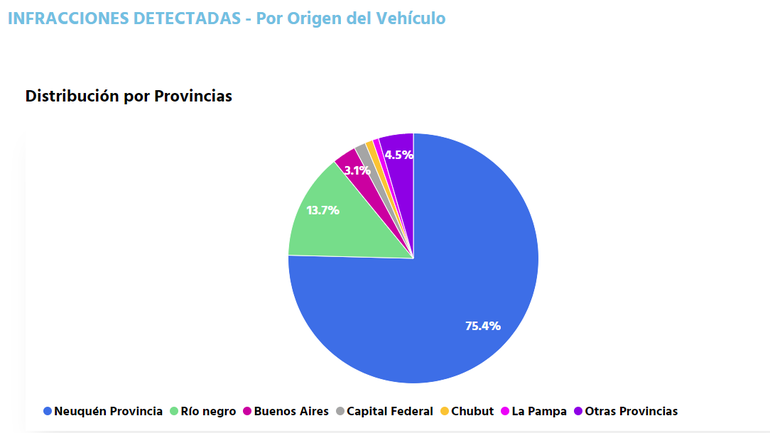 El 75% de los infractores son de vehículos patentados en la provincia de Neuquén, mientras que el 14% son de Río Negro. Luego sigue un porcentaje menor en el que se encuentran Chubut y La Pampa, en quinto y sexto lugar respectivamente, y luego siguen otras provincias.