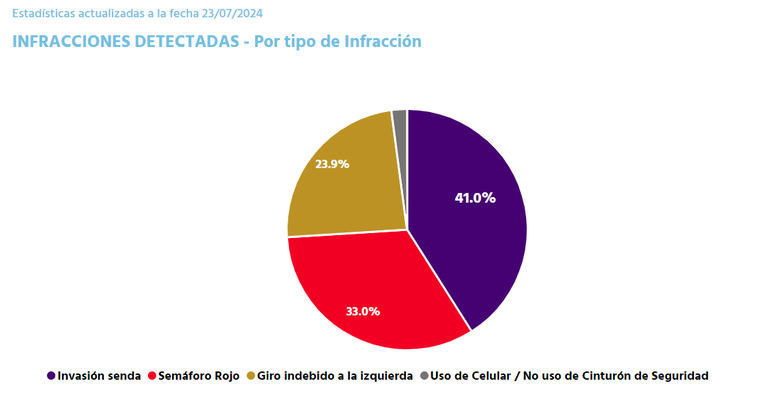 Hoy, según las estadísticas, la infracción más cometida es la invasión de la senda peatonal, siendo un 41% de la totalidad, superando el cruce de semáforo en rojo y el giro indebido, aunque el semáforo en rojo sigue siendo alto: es del 33%. El giro indebido está en el tercer puesto con el 24%.