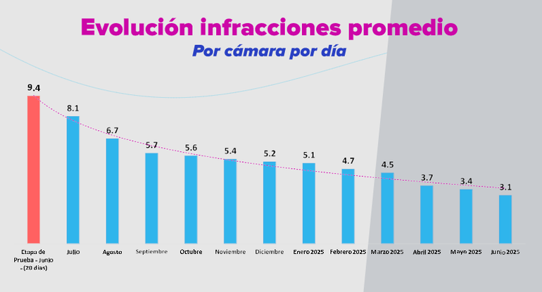 Uno de los indicadores más positivos del monitoreo es la baja sostenida en la cantidad diaria de infracciones. Según los registros: