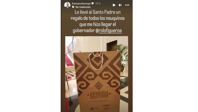 En la visita, le dio el presente elegido por el gobernador neuquino Rolando Figueroa. “Le dije a Rolo, 'quiero llevar algo en nombre de todos los neuquinos al Santo Padre y me parece que institucionalmente corresponde que seas vos este quien elija el regalo’. Y así lo hizo. Me hizo llegar un regalo de Artesanías Neuquinas y lo llevé al Vaticano”, agregó.