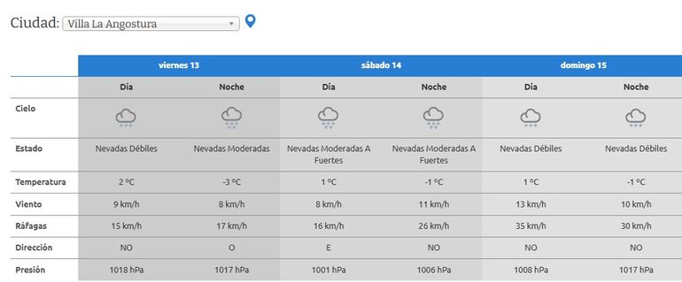 Es el caso de la localidad cordillerana de Villa La Angostura, donde la AIC pronostica nevadas débiles el miércoles que serán moderadas y fuertes el viernes, sábado y domingo, con una temperatura máxima de 1°C.