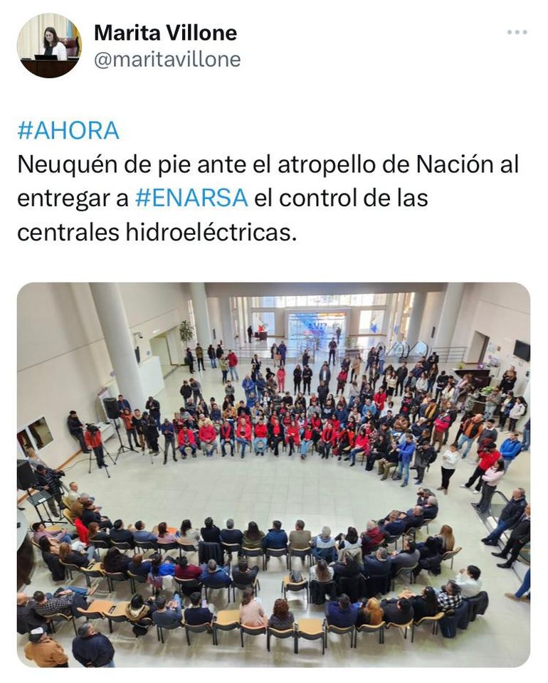 "Los presentes en el Encuentro en Defensa de las Hidroeléctricas del Comahue, convocados por la necesidad y urgencia que impone la defensa de nuestra integridad territorial y los principios que rigen el sistema federal que emerge de nuestra organización constitucional nacional, afirmamos: La propiedad de la Provincia del Neuquén de sus fuentes energéticas en los términos del artículo 95 de la Constitución Provincial", indicaron en el documento.