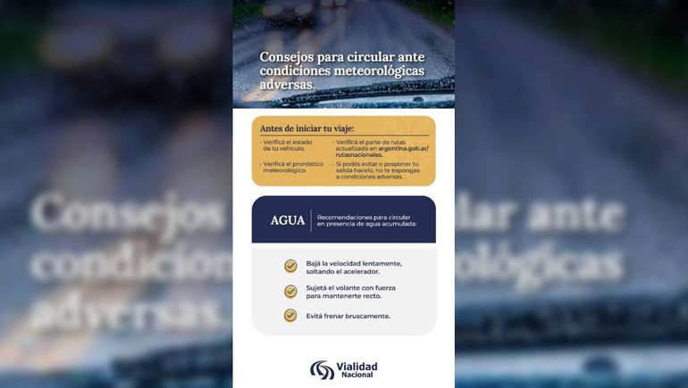 Desde el distrito neuquino de Vialidad Nacional ofrecieron algunos consejos para las personas que tengan que circular por las rutas que atraviesan el territorio.