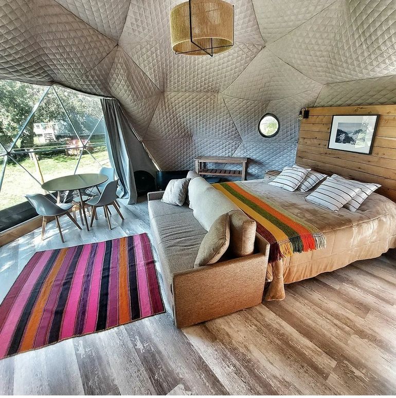 Estos domos geodésicos están pensados para dos personas, tienen con baño privado, kitchenette, calefacción ecológica y deck con parrilla. Además, el predio cuenta con espacios comunes, desayuno y opciones de relax. La tarifa por noche es de $145.000, con una estadía mínima de dos noches.