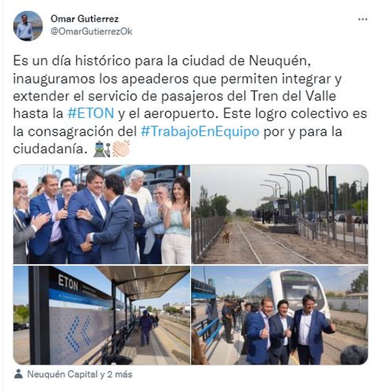 “Hace 30 años que muchos funcionarios municipales y nacionales no pudieron resolver esto y hoy es palabra cumplida: devolverle el tren a los vecinos y a los estudiantes con el boleto gratuito. Este tren que trae la ilusión a Neuquén”, dijo el intendente.