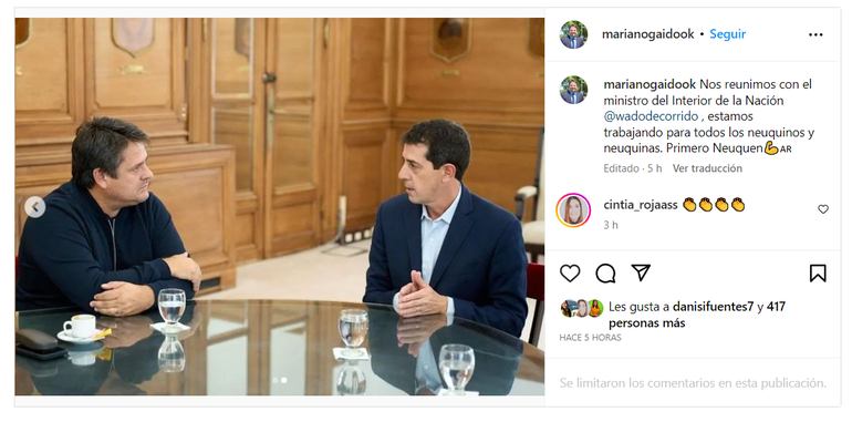 El intendente capitalino, Mariano Gaido, reelecto por otro período en las elecciones del pasado domingo, fue recibido este jueves por el ministro del Interior de la Nación, Eduardo 'Wado' De Pedro, en un encuentro que llevó a cabo en Casa Rosada.