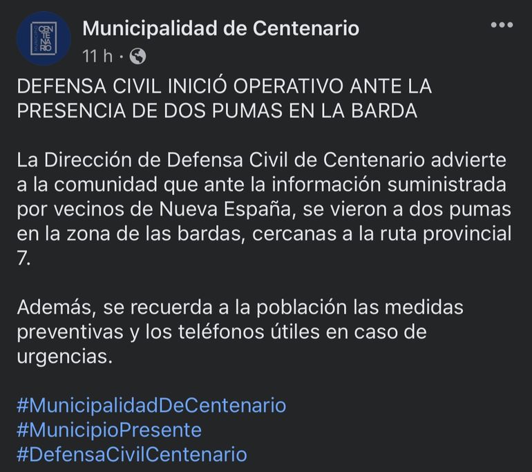 El video que circuló y del que se nutrieron los medios de comunicación, e incluso con un comunicado oficial de la Municipalidad de Centenario anoche advertía sobre los cuidados que debían tener los vecinos, ante la presencia de estos dos felinos de gran porte, que finalmente eran gatos.