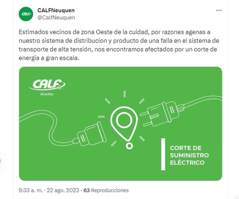 Desde CALF informaron que el corte en el suministro se debió a un problema “ajeno a la Cooperativa”. La falla se registró en el sistema de transporte que ocasionó que se encuentren fuera de servicio tres alimentadores de la Estación Transformadora Gran Neuquén GN4, GN5 y GN6.