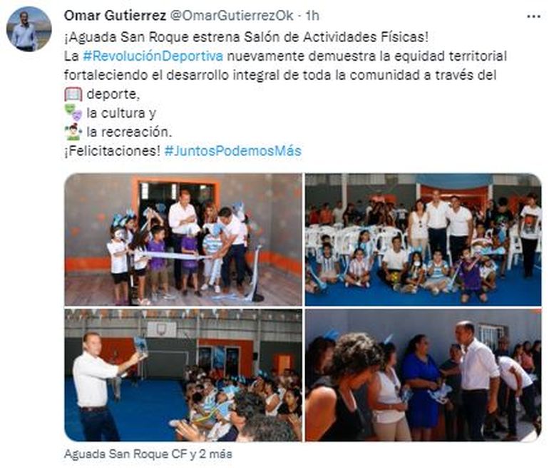 Luego de entregar elementos para la práctica de distintos deportes, el mandatario manifestó estar “muy contento por poder estar hoy aquí viendo cómo se hizo realidad un objetivo y una necesidad que tenía Aguada San Roque”. Además, agregó: “Este gimnasio constituye un eslabón más en la revolución de la cultura y el deporte que llevamos adelante, como lo son espacios similares que inauguramos en El Sauce, Santo Tomás y Paso Aguerre, y cómo lo haremos en Chihuido y Sauzal Bonito”.