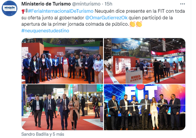 El mandatario neuquino expresó que “es muy importante poder mostrar nuestros avances en materia turística y poder estar presentes en la FIT, porque acá se vende el turismo neuquino, se vincula la oferta turística con la demanda, porque están presentes los operadores, los prestadores de servicios, los distintos actores del desarrollo turístico, las líneas aéreas, el turismo receptivo de todo el país”.