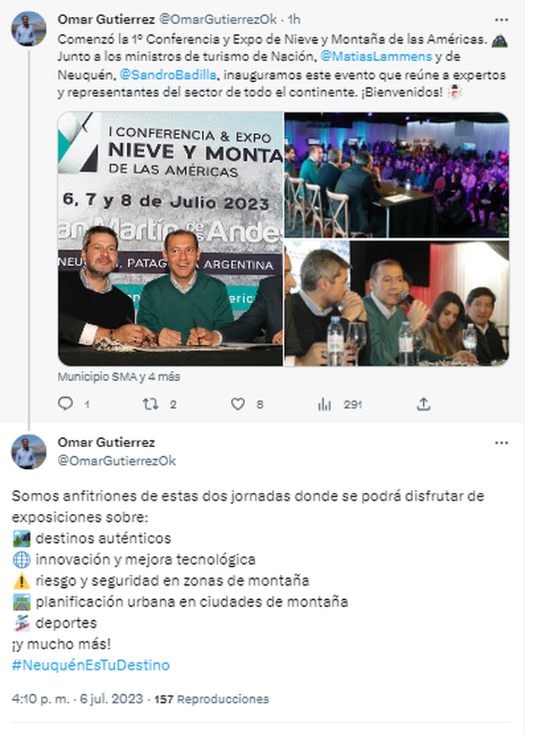 Indicó que entre “200 y 300 millones de personas en el mundo se ponen el traje de turista para ir a la montaña. La montaña nos acerca y nos integra”. En este sentido, informó que “este mes de julio, 30.000 pasajeros llegarán a San Martín de los Andes a través de nuestro aeropuerto”, en tanto que para agosto se esperan 40.000 pasajeros.