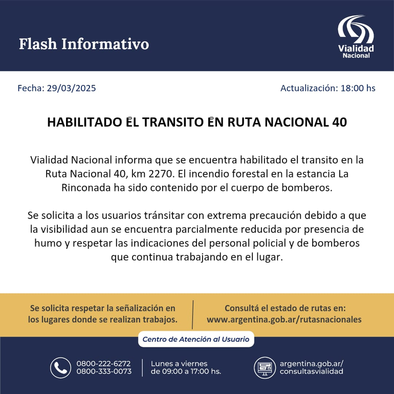 Recién pasadas las 18, una vez que estaban dadas las garantías para poder circular por la calzada, desde Vialidad Nacional confirmaron que quedaba habilitada. No obstante, recomendaron a los conductores que transiten con extrema precaución porque la visibilidad se encuentra parcialmente reducida. También recordaron acatar las indicaciones de la Policía y Bomberos que continuaban en el lugar.