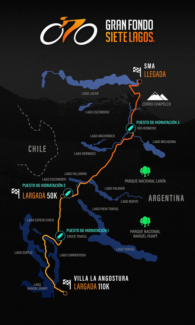 Gran Fondo Siete Lagos es la competencia que atrae a ciclistas de todo el país a rodar por los caminos y paisajes que recorre la tradicional Ruta 40. Con el objetivo de mantener la seguridad y facilitar las condiciones de los participantes para esta nueva edición, se dispuso el corte total de la ruta.