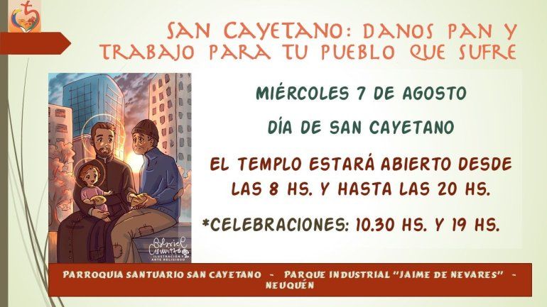 La parroquia San Cayetano del barrio Parque Industrial de la capital neuquina estará abierta desde las 8 a las 20 para recibir a los peregrinos que vengan a hacer sus peticiones. Habrá misa a las 10.30 y a las 19 que estará presidida por el obispo. Esta celebración se suma a las múltiples actividades previstas en parroquias y capillas de la capital neuquina y de localidades del interior de la provincia.