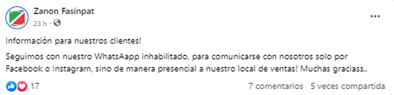 Hasta el viernes seguían con su Whatsapp inhabilitado para comunicarse con la gente, por lo que solicitaron que las consultas se realicen solo por Facebook o Instagram. También, las personas se pueden acercar hasta el local de ventas ubicado en Parque Industrial, sobre la Ruta Provincial N°7, a la altura del kilómetro 7.