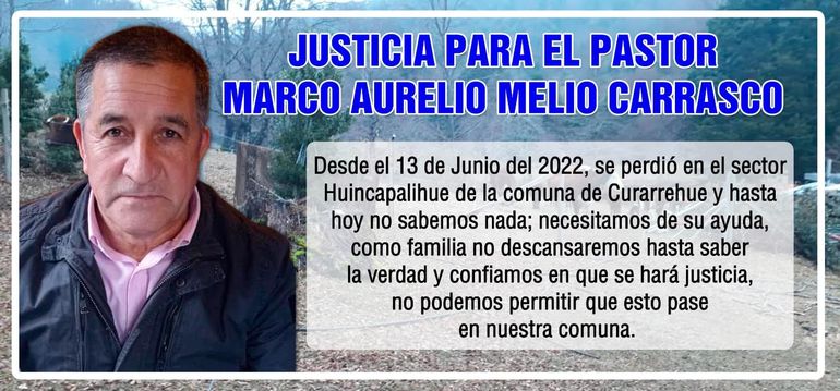 Marco Aurelio Melío Carrasco se encuentra desaparecido desde el 13 de agosto de 2022, luego de haber salido a caminar por la alta cordillera en la comuna de Curarrehue, Región de La Araucanía. Fue en compañía de su mascota hacia el sector Juincapalihue, en busca de sus animales. Desde ese día se desconoce con certeza su paradero. La mascota, por su parte, pudo regresar al domicilio días más tarde.