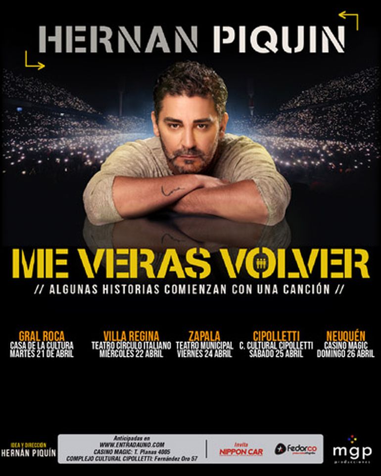 Su presentación en Cipolletti será este sábado 25 de abril en el Complejo Cultural Cipolletti (CCC) y en Neuquén lo hará el domingo 26 de abril a las 20 en el Casino Magic. Las entradas se pueden adquirirse en la página web de la productora Fedorco. También se presentará en Zapala, este viernes 24 en el Teatro Municipal.
