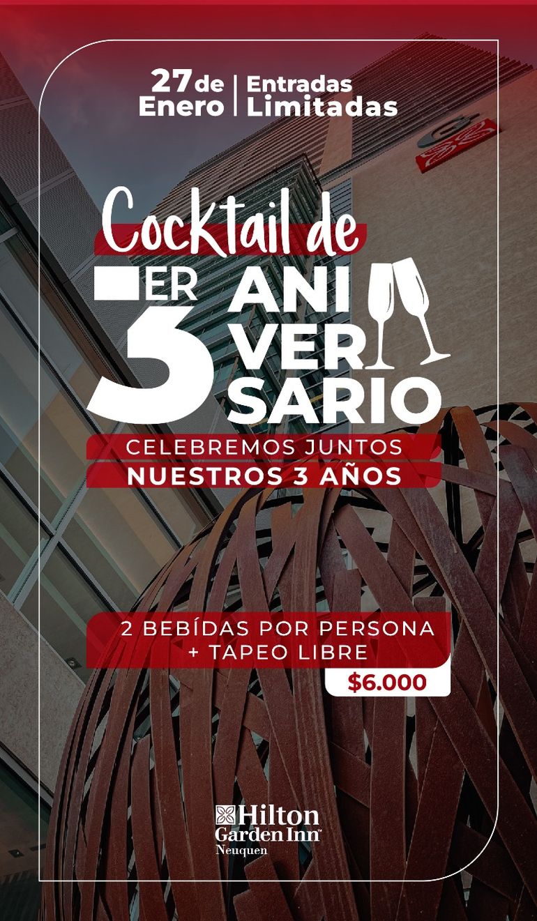 Este viernes 27 de enero, Hilton Garden Inn Neuquén festeja su tercer aniversario en la ciudad de Neuquén con un cocktail abierto a la comunidad del Alto Valle.