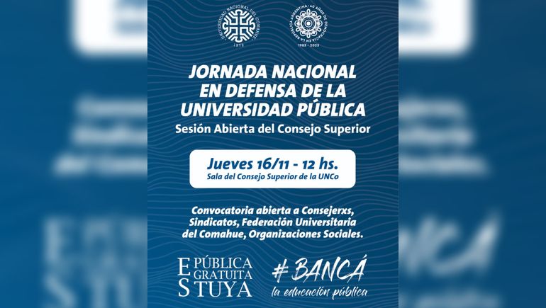 Desde la Universidad Nacional del Comahue (UNCo), convocaron a participar a consejeros, sindicatos, a la Federación Universitaria del Comahue y organizaciones sociales. Será a las 12 en la sala del Consejo Superior.