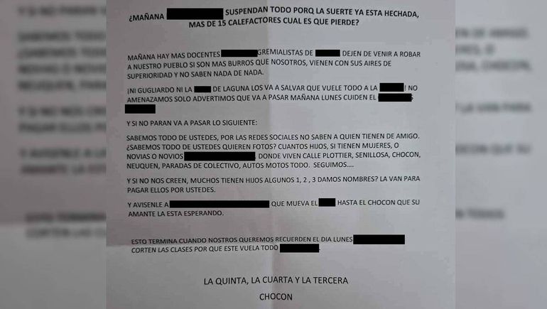 Las notas anónimas fueron halladas en diferentes aulas de la escuela secundaria donde mencionan a gremialistas. "Suspendan todo porque la suerte está echada. Más de 15 calefactores ¿Cuál es el que pierde?", es el título de la misiva.
