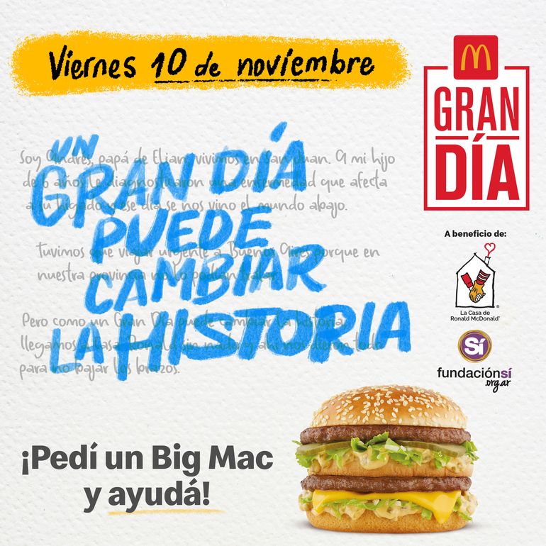 Este viernes 10 de noviembre se lleva adelante una nueva edición del Gran Día, la acción solidaria más importante de la marca donde el 100% de lo recaudado por la venta del Big Mac será donado a Fundación Sí y Casa Ronald. Todos pueden contribuir con su compra y generar un impacto positivo para las organizaciones.