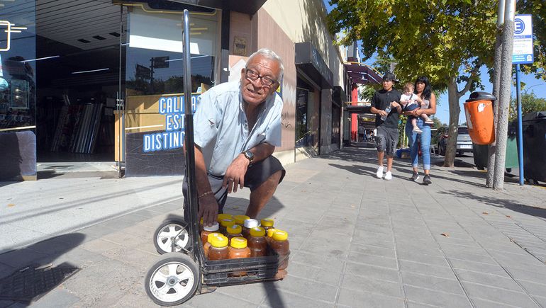 Uno de los vendedores más conocidos del centro neuquino, o al menos lo más conocido es su cántico, es José. El hombre de 72 años vende miel, "miel de Aluminé. El kilo de este producto sale 5500 pesos y según indicó "la gente no se priva de comprar cuando es comida".