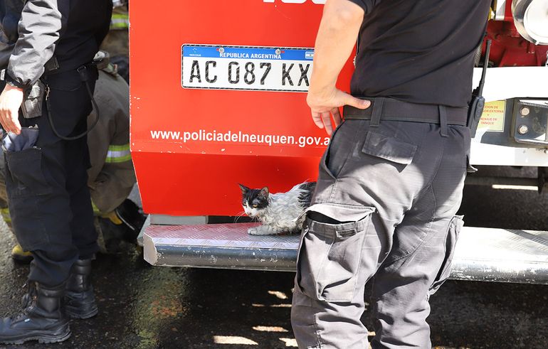 Minutos después de que el incendio fue apagado, LMNeuquén estuve presente en el lugar y pudo captar el momento en que los bomberos intentaban salvar a uno de los gatitos, haciéndole masajes en su pecho y colocándole una máscara de oxígeno.