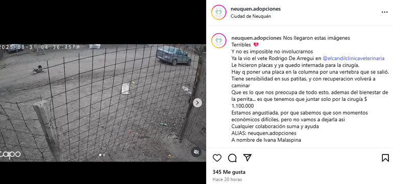 La operación está prevista para este martes. Se agradece mucho cualquier colaboración que se pueda hacer, por mínima que sea, al alias neuquen.adopciones (a nombre de Ivana Malaspina), o directamente en la veterinaria El Candil, ubicada en calle Alem, Cipolletti.