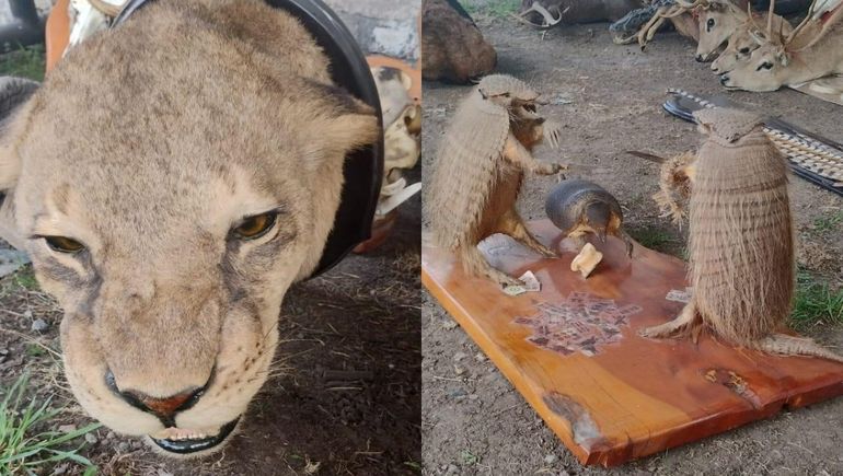 En total se reunieron más de 20 cabezas de animales taxidermizados entre los que destacaron una cabeza de leona africana, una de cerdo africano, antílopes, muflones, seis peludos y cinco cabezas de ciervos colorados. Además, hallaron tres cráneos de jabalí europeos, un cuero de puma, un faisán real, 33 astas de ciervo y alrededor de 18 kilos de recortes de astas. También se incautó un arma de fuego con silenciador y municiones.