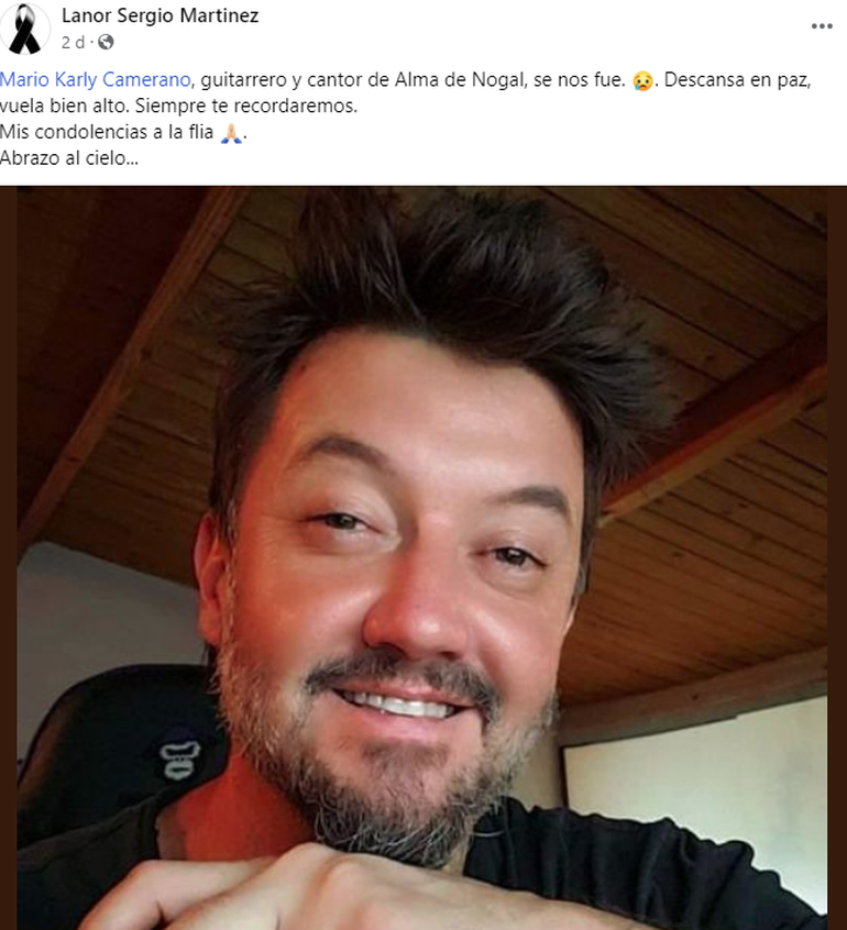 En el ambiente del folclore lamentaron el repentino desenlace que tuvo Mario "Karly" Camerano, luego de sufrir un episodio de hipertensión muy grande que le provocó un ACV (accidente cerebrovascular). El sábado se había juntado a compartir un asado con sus amigos y compañeros de Alma de Nogal, con quienes llegó a hacer una sobremesa. Para cuando quiso sacar la guitarra, se desplomó; sus amigos lo contuvieron e intentaron lo imposible para salvarlo.