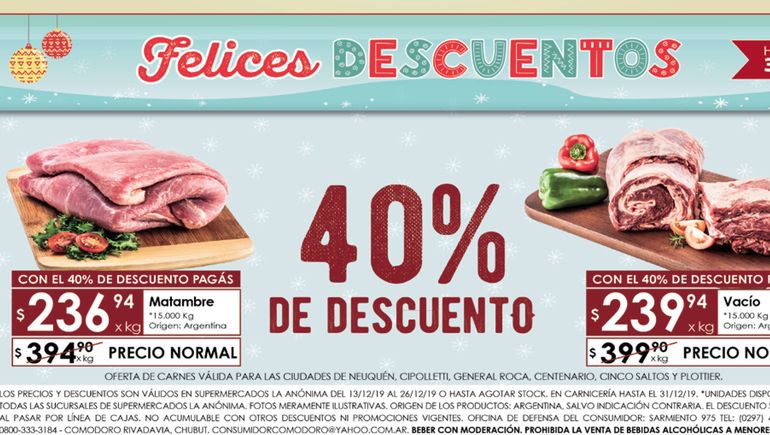 En el rubro de las carnes, la cadena Coto promocionaba el pavo a 189,90 pesos el kilo, el matambre para los tradicionales arrollados o para cocinar a la parrilla costaba 229 pesos por kilo y cada chivito del norte neuquino se ofrecía en las carnicerías de la capital neuquina a 290 pesos el kilo (ya considerado caro, de acuerdo a crónicas periodísticas de la época). El vacío y el asado se ofertaba en La Anónima a 240 pesos por kilo.