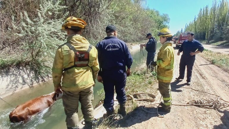 El animal cayó al curso de agua y quedó atrapado, pero gracias a los bomberos voluntarios de Centenario pudo salir sana y salva.