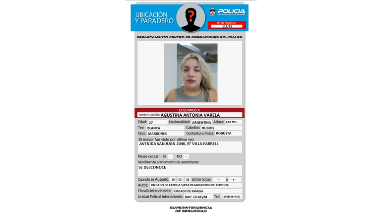 Se trata de Agustina Antonia Varela, de nacionalidad argentina, contextura física robusta, una altura de 1,60 metros, de tez blanca, ojos marrones y cabellos rubios. Desde las fuerzas de seguridad informaron que se desconoce la vestimenta que utilizaba al momento de su desaparición.