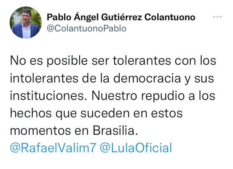 “No es posible ser tolerantes con los intolerantes de la democracia y sus instituciones. Nuestro repudio a los hechos que suceden en estos momentos en Brasilia”, dijo Pablo Gutiérrez Colantuono, secretario del COPADE y quien apoyó la campaña de Lula en sus redes sociales.