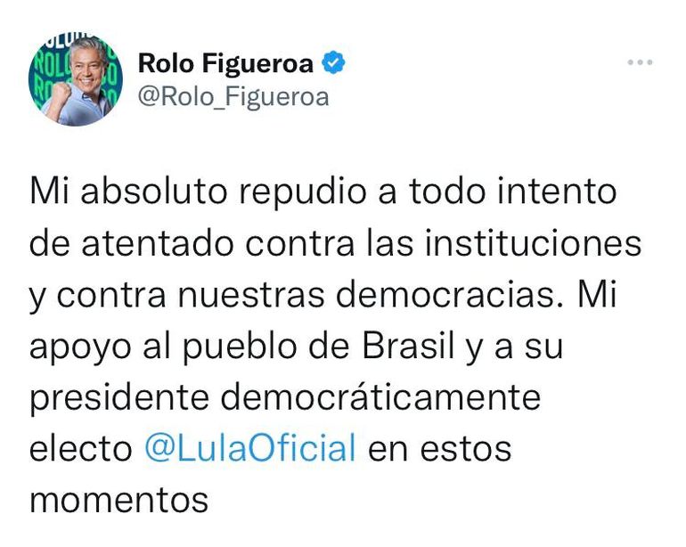 Rolando Figueroa, diputado nacional por el MPN, también se refirió a la situación ocurrida en Brasilia y condenó los ataques al gobierno de Lula. “Mi absoluto repudio a todo intento de atentado contra las instituciones y contra nuestras democracias. Mi apoyo al pueblo de Brasil y a su presidente democráticamente electo @LulaOficial en estos momentos”, escribió en su cuenta de Twitter.