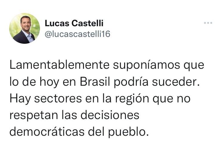 En tanto que el diputado provincial por Avanzar, Lucas Castelli dijo: “Lamentablemente suponíamos que lo de hoy en Brasil podría suceder. Hay sectores en la región que no respetan las decisiones democráticas del pueblo”.