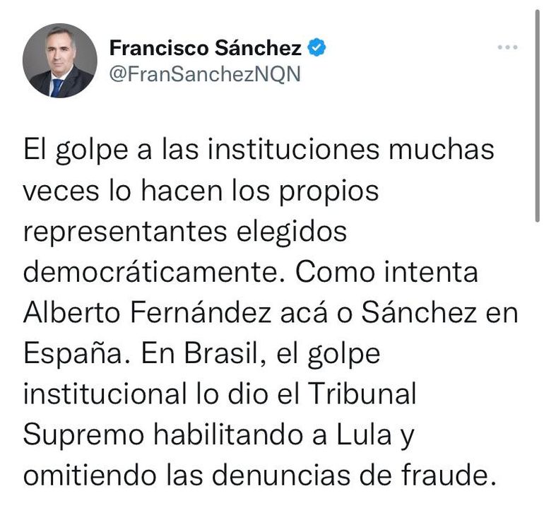 La vos más disonante fue la del diputado nacional por Juntos por el Cambio, Francisco Sánchez, dijo dijo: "El golpe a las instituciones muchas veces lo hacen los propios representantes elegidos democráticamente. Como intenta Alberto Fernández acá o Sánchez en España. En Brasil, el golpe institucional lo dio el Tribunal Supremo habilitando a Lula y omitiendo las denuncias de fraude".
