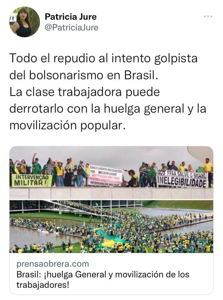 Por su parte, Patricia Jure, ex diputada provincia y militante del Partido Obrero se expresó sobre el intento de golpe de estado: “Todo el repudio al intento golpista del bolsonarismo en Brasil. La clase trabajadora puede derrotarlo con la huelga general y la movilización popular”.