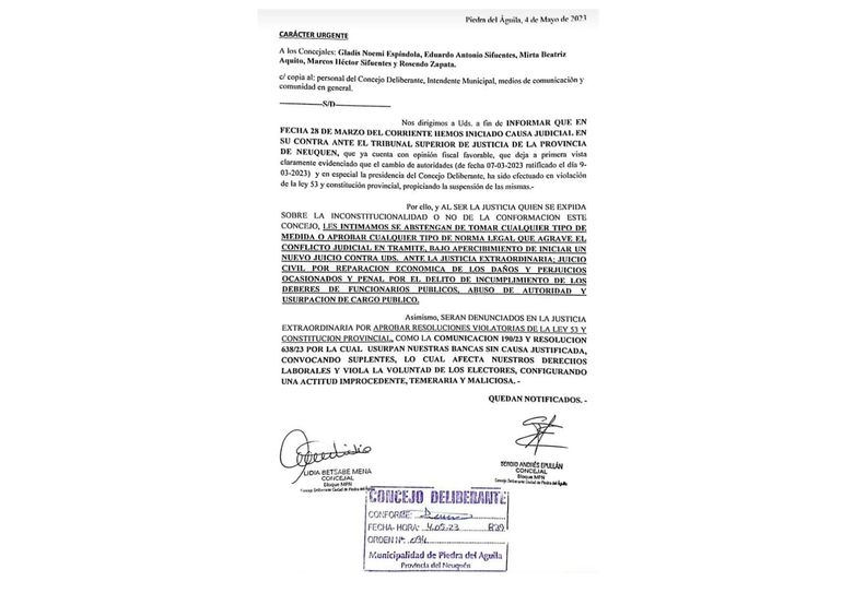 En el comunicado fechado este 4 de mayo, Epullán y Betsabe Mena intimaron a sus colegas del cuerpo legislativo para que "se abstengan de tomar cualquier tipo de medida o aprobar cualquier tipo de norma legal que agrave el conflicto judicial en trámite, bajo apercibimiento de iniciar un nuevo juicio contra ustedes ante la justicia extraordinaria, juicio civil por reparación económica de los daños y perjuicios ocasionados y penal por el delito de incumplimiento de los deberes de funcionarios públicos, abuso de autoridad y usurpación de cargo público”.