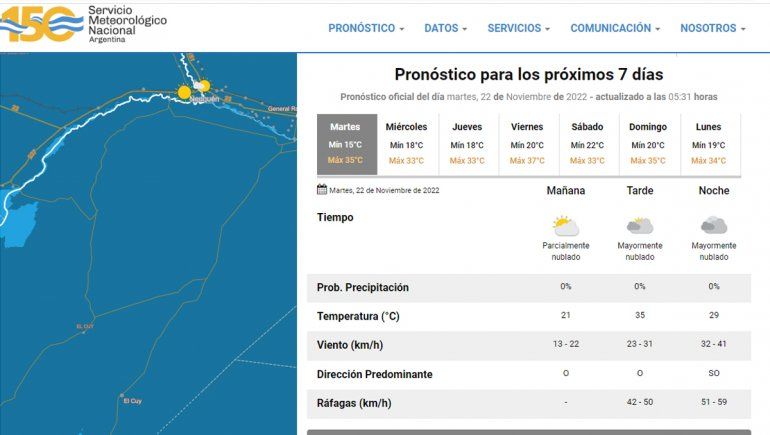El Servicio Meteorológico Nacional (SMN) pronosticó tiempo bueno, caluroso y ventoso hacia la tarde/noche. Para esta mañana se prevé cielo parcialmente nublado con una temperatura de 21 grados, mientras que por la tarde estará mayormente nublado con una máxima que alcanzará los 35 grados en la región. Habrá viento de moderado a fuerte con ráfagas de entre 51 y 59 kilómetros por hora.