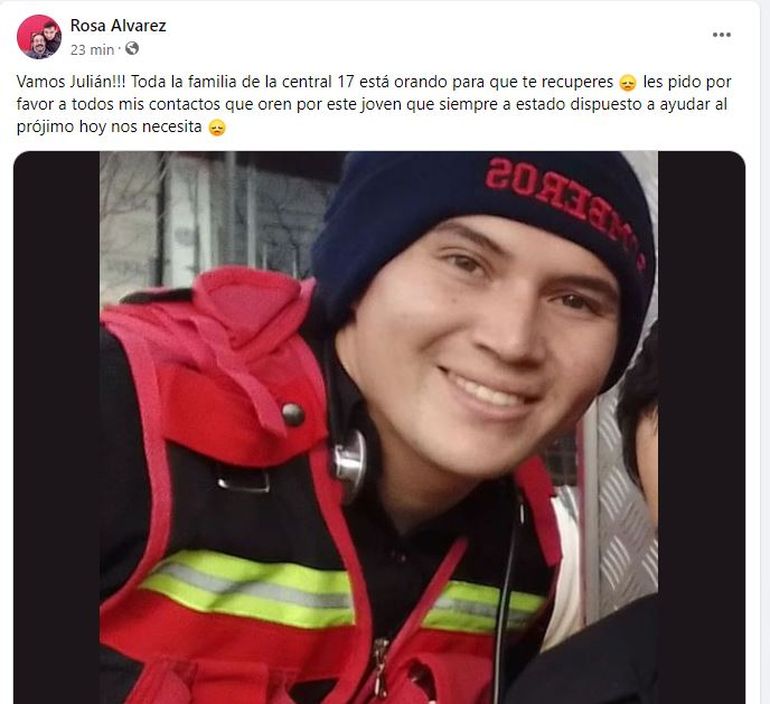 Se trata de un joven de 22 años identificado como Julián Arroyo. Es bombero voluntario y muy querido por la comunidad. Varios vecinos y vecinas están haciendo cadenas de oración en las redes sociales para que pueda salir adelante.