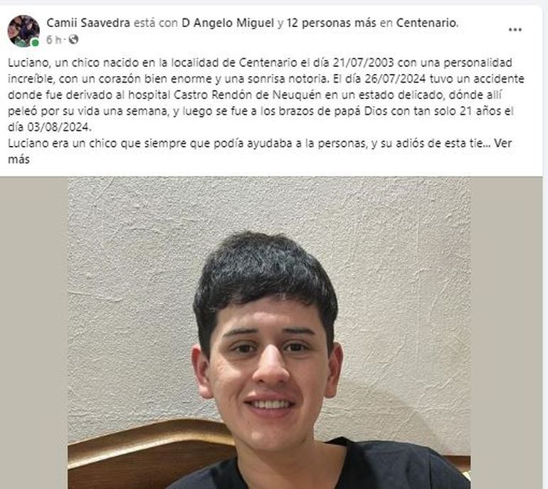 "Excelente persona, con un corazón bien enorme y una sonrisa notoria. Siempre ayudando a la gente". Así era Luciano Saavedra, el joven de 21 años que falleció en un trágico accidente de tránsito ocurrido en Centenario. Así lo recordó su hermana Camila.