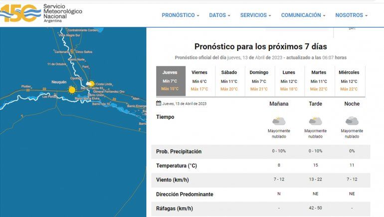 El viernes habrá un leve repunte de la temperatura, según el SMN. Se mantendrán las condiciones climáticas en la región. En la madrugada estará parcialmente nublado y fresco, con una temperatura mínima de 6 grados y en horas de la mañana se elevará a 9 grados. Hacia la tarde seguirá el cielo mayormente nublado y la temperatura alcanzará la máxima de 17 grados. Por la noche habrá un bajo porcentaje de probabilidad (10%) de precipitaciones. El viento será débil y vendrá del sector norte.