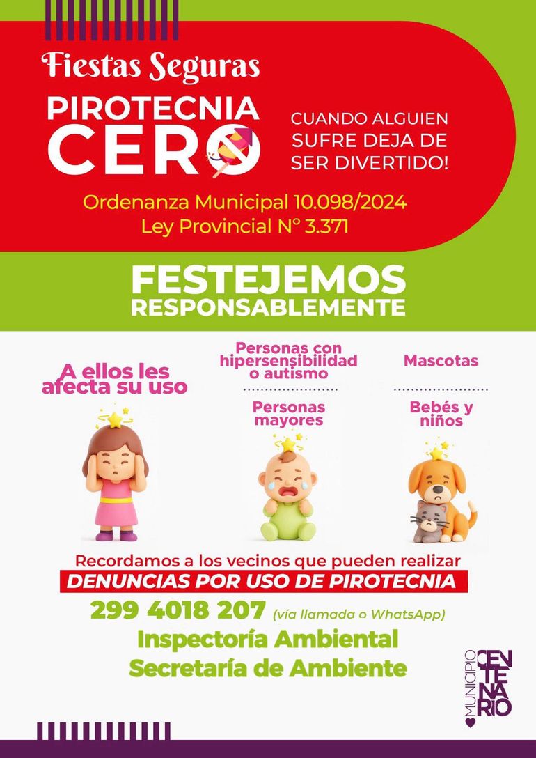 Si escuchas o ves uso de pirotecnia, podes realizar tu denuncia al: 2994018207 (vía llamada o WhatsApp) que te derivará a Inspectoría Ambiental – Secretaría de Ambiente.