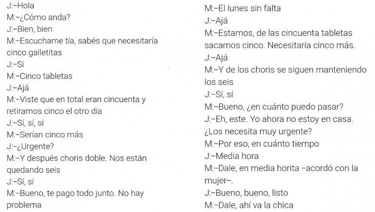 Por primera vez conocía de primera mano los diálogos que mantenían en clave con otros colaboradores para acopiar, vender y distribuir marihuana y cocaína en el Alto Valle. Es que no llamaban a la droga por su nombre. Lo hacían en código: “chori doble”, “tableta”, “galletita”, “blanca”, “blanquita”, “humito”, por mencionar algunos términos.