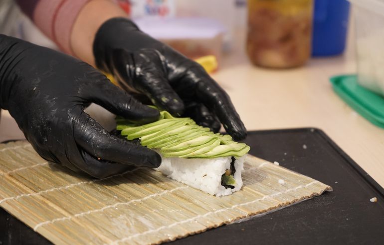 Candela comienza su jornada bien temprano y se pasa casi todo el día en la cocina. A las ocho, cuando Lucas se va a trabajar, deja listo el arroz para armar los pedidos que le encargan el día anterior. Y mientras brinda el tiempo necesario para macerar una vinagreta o producir un "caviar falso" de tomate, se entretiene creando cada pieza como si fuera una obra de arte. Se moja los guantes de látex para amasar la dosis justa de arroz y la esparce con cuidado sobre las algas secas que ubica en una esterilla de bambú.