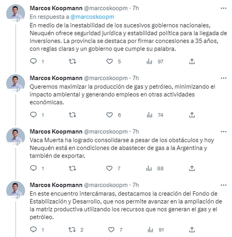 “Nuestro objetivo es maximizar la producción de gas y petróleo, minimizando el impacto ambiental, y con esos recursos poder consolidar la ampliación de la matriz productiva que ya está en marcha en la provincia de Neuquén”, aseguró Koopmann, señalando que “vamos a generar las condiciones para ampliar el desarrollo de sectores como el turismo, la economía del conocimiento, las energías renovables, la producción primaria integrada, la logística y los servicios”.
